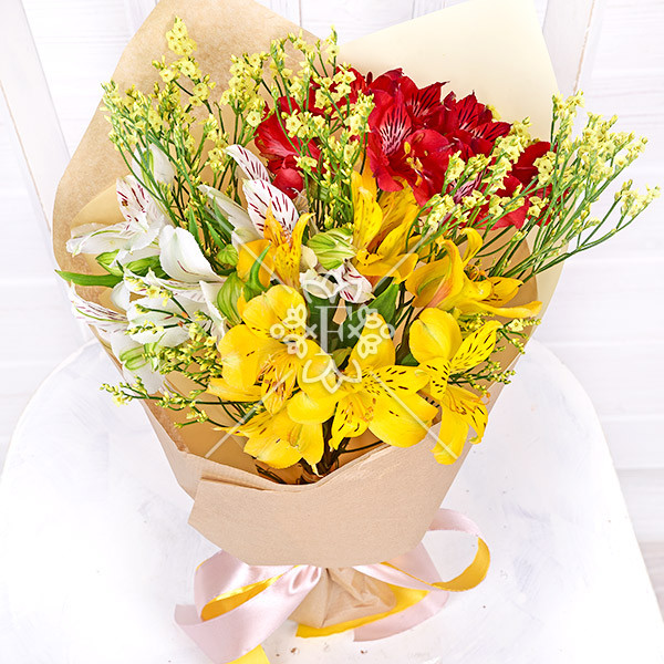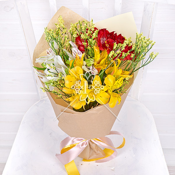 Альстромерия красная – 1 шт., альстромерия белая – 1 шт., альстромерия желтая – 1шт, лимониум желтый – 1 шт., упаковка, лента.